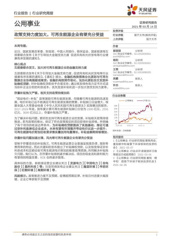 【天风证券】【20210314】公用事业行业研究周报:政策支持力度加大,可再生能源企业有望充分受益-15页