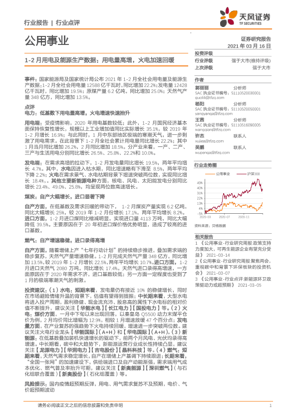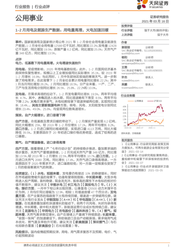 【天风证券】【20210316】1-2月用电及能源生产数据:用电量高增,火电加速回暖-6页