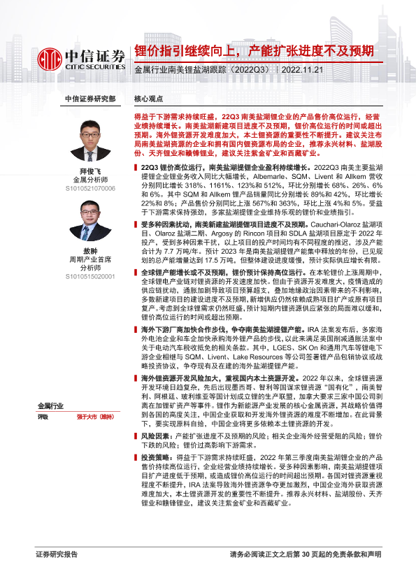【中信证券】【20221121】金属行业南美锂盐湖跟踪(2022Q3):锂价指引继续向上,产能扩张进度不及预期-31页