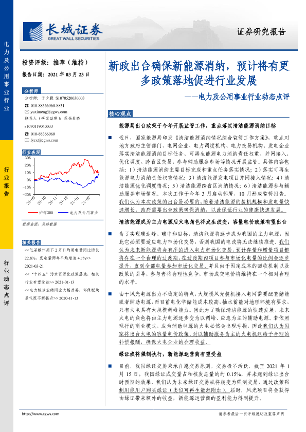 【长城证券】【20210323】新政出台确保新能源消纳,预计将有更多政策落地促进行业发展-3页
