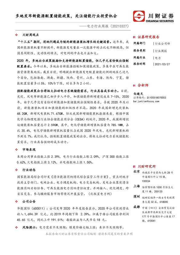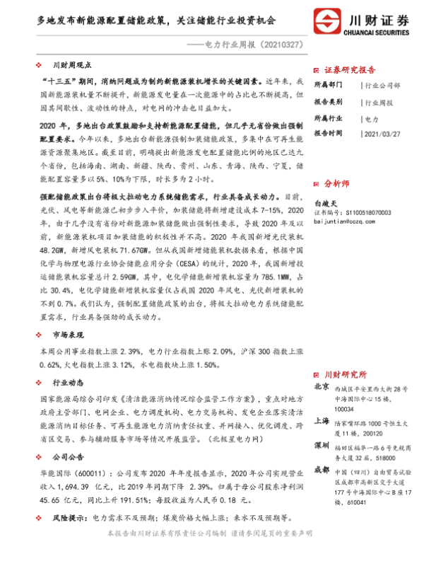 【川财证券】【20210327】多地发布新能源配置储能政策,关注储能行业投资机会-10页