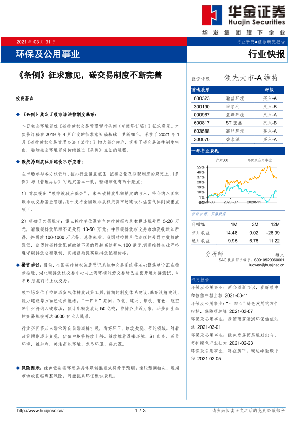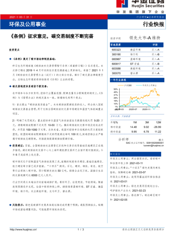 【华金证券】【20210331】环保及公用事业行业:《条例》征求意见,碳交易制度不断完善-3页
