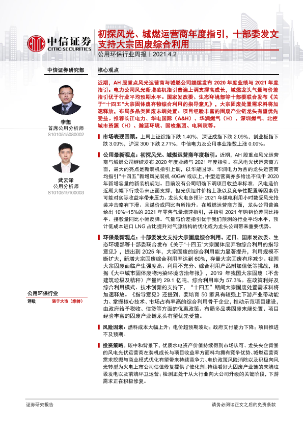 【中信证券】【20210402】公用环保行业周报:初探风光、城燃运营商年度指引,十部委发文支持大宗固废综合利用-13页
