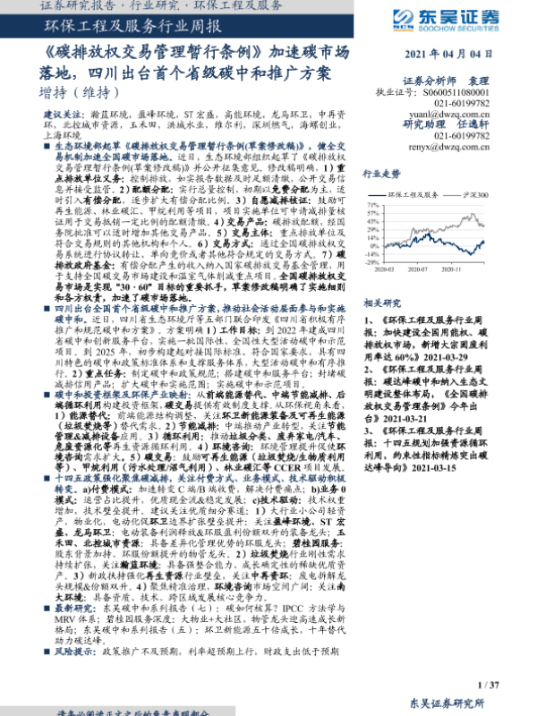 【东吴证券】【20210404】环保工程及服务行业周报:碳排放权交易管理暂行条例加速碳市场落地,四川出台首个省级碳中和推广方案-37页