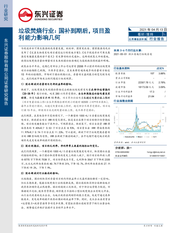 【东兴证券】【20210413】垃圾焚烧行业:国补到期后,项目盈利能力影响几何-4页