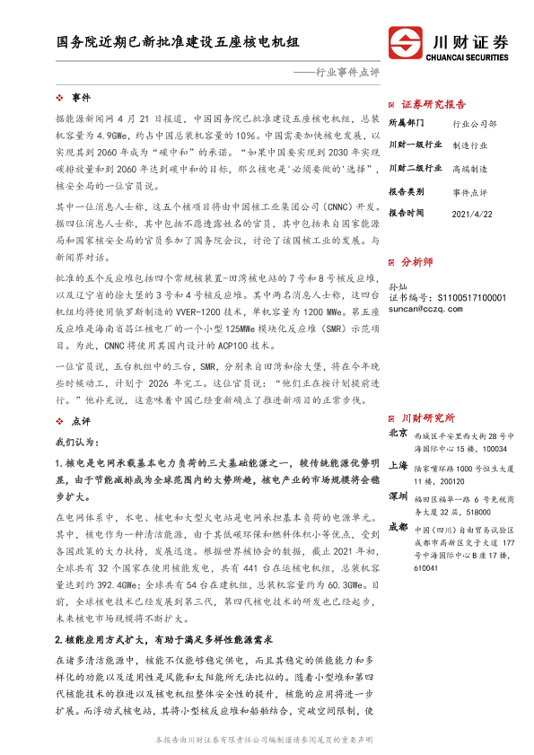 【川财证券】【20210422】高端制造行业事件点评:国务院近期已新批准建设五座核电机组-3页