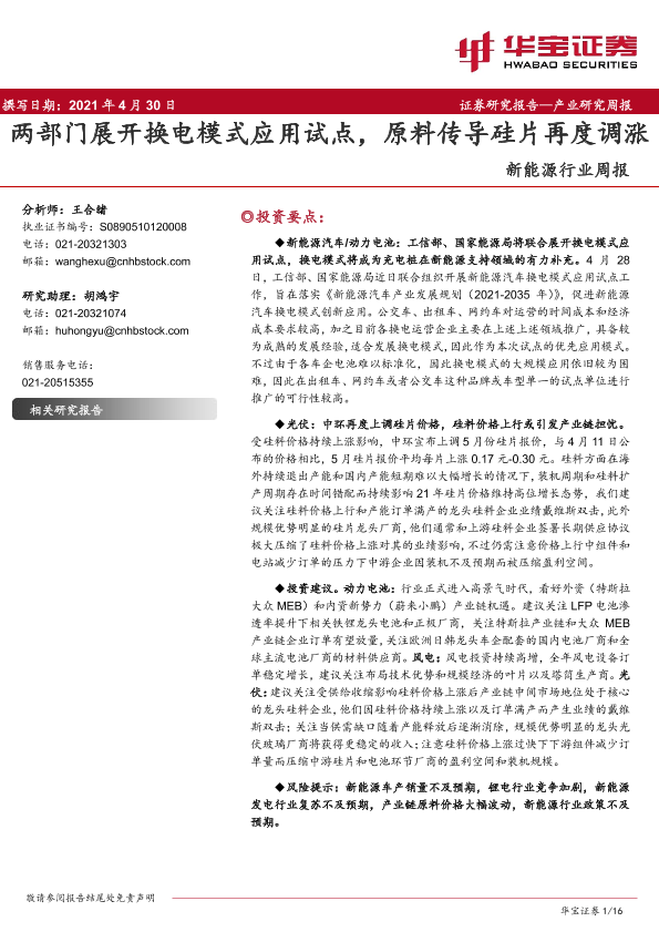 【华宝证券】【20210430】新能源行业周报:两部门展开换电模式应用试点,原料传导硅片再度调涨-16页