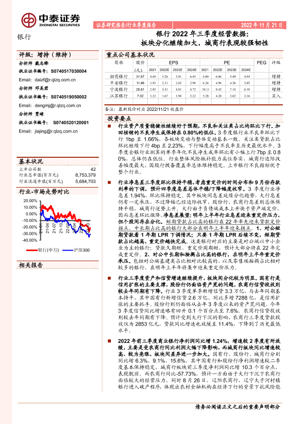 【中泰证券】【20221121】银行2022年三季度经营数据:板块分化继续加大,城商行表现较强韧性-15页