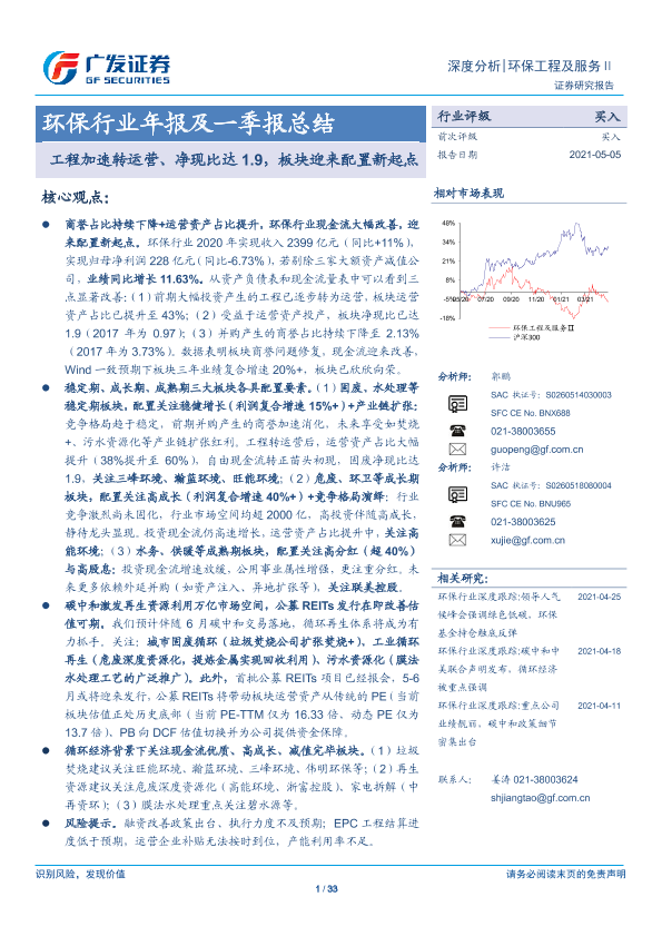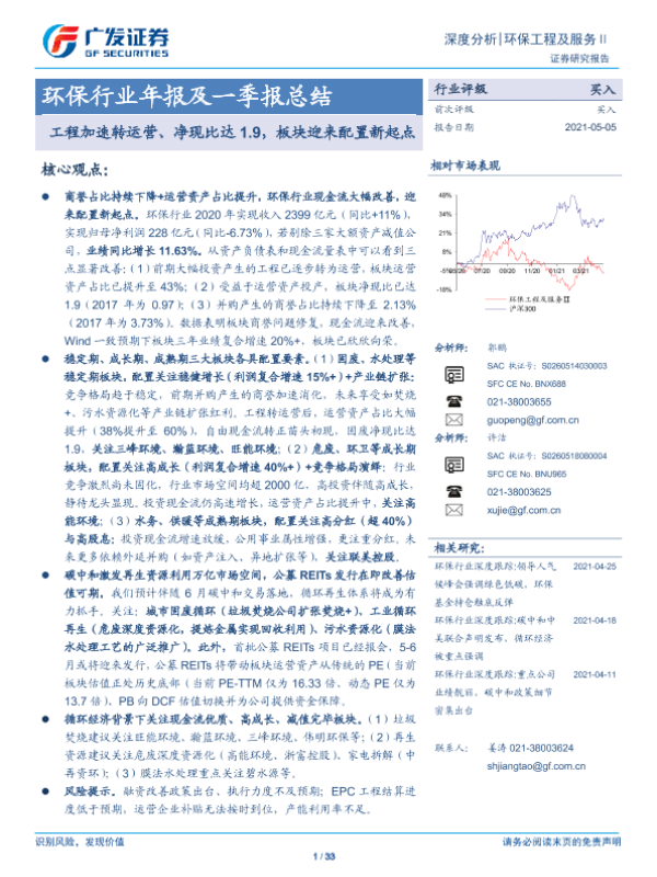 【广发证券】【20210505】环保行业年报及一季报总结:工程加速转运营、净现比达1.9,板块迎来配置新起点-33页