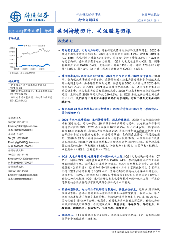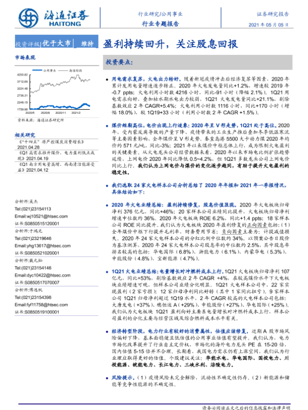 【海通证券】【20210505】公用事业行业专题报告:盈利持续回升,关注股息回报-20页