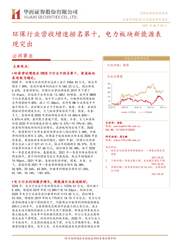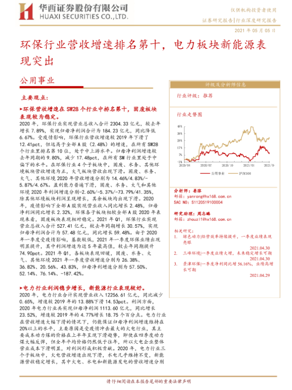 【华西证券】【20210505】公用事业行业:环保行业营收增速排名第十,电力板块新能源表现突出-35页