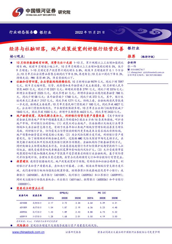 【银河证券】【20221121】银行业动态报告:经济与社融回落,地产政策放宽利好银行经营改善-18页