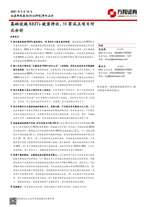 【万和证券】【20210514】公用事业行业:基础设施REITs破茧待出,10家试点项目对比分析-12页
