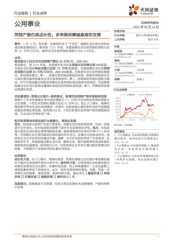 【天风证券】【20210514】公用事业:焚烧产能仍具成长性,多举措保障健康高效发展-2页