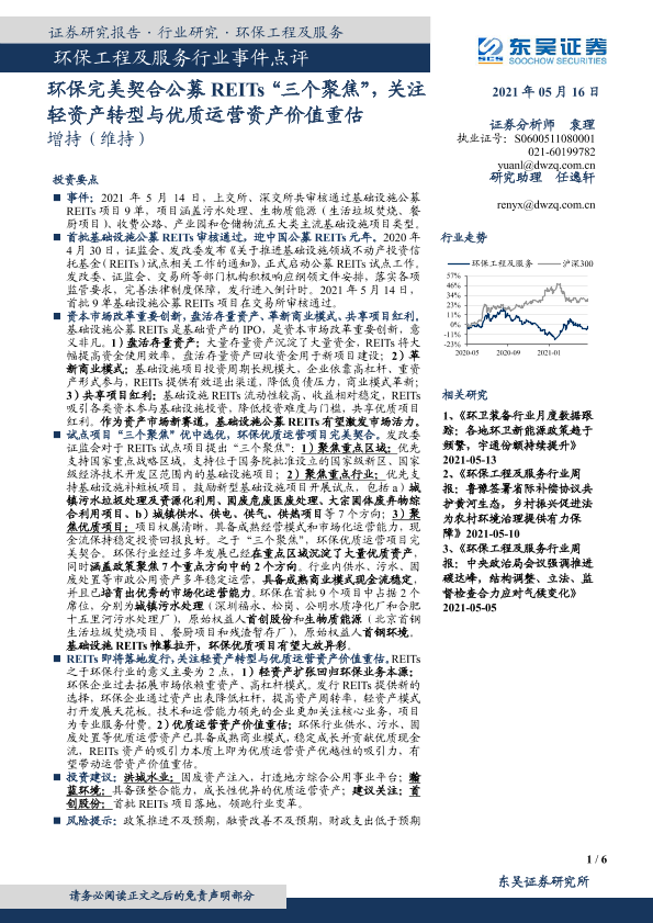 【东吴证券】【20210516】环保工程及服务行业事件点评:环保完美契合公募REITs“三个聚焦”,关注轻资产转型与优质运营资产价值重估-6页
