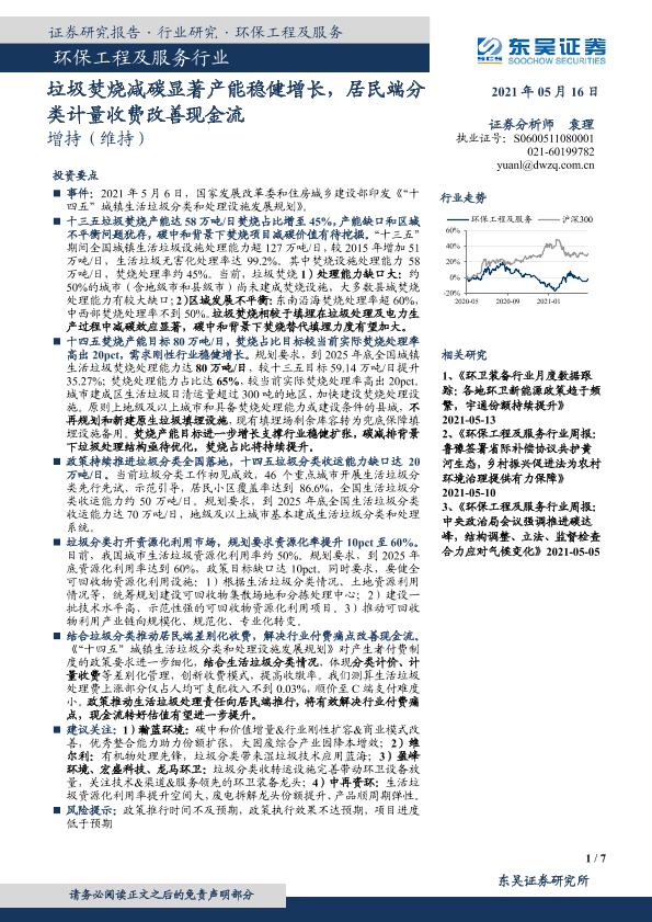 【东吴证券】【20210516】环保工程及服务行业:垃圾焚烧减碳显著产能稳健增长,居民端分类计量收费改善现金流-7页