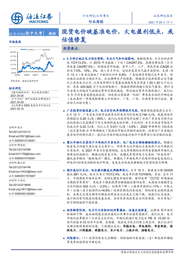 【海通证券】【20210517】公用事业行业周报:现货电价破基准电价,火电盈利低点,或估值修复-2页