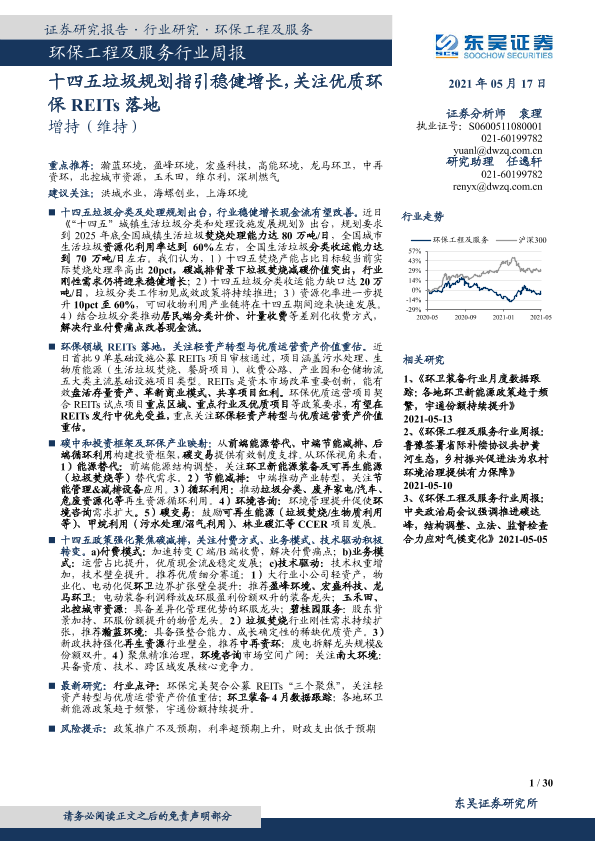 【东吴证券】【20210517】环保工程及服务行业周报:十四五垃圾规划指引稳健增长,关注优质环保REITs落地-30页