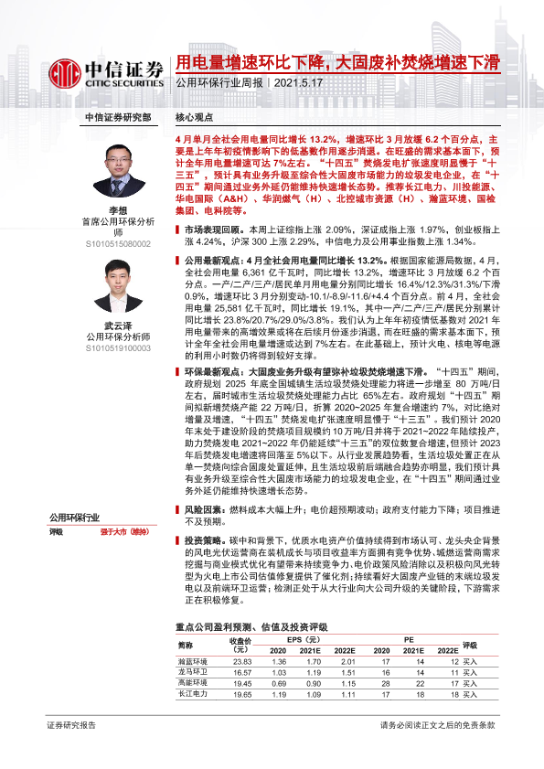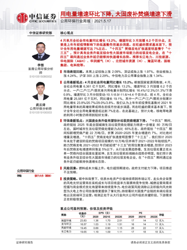 【中信证券】【20210517】公用环保行业周报:用电量增速环比下降,大固废补焚烧增速下滑-9页