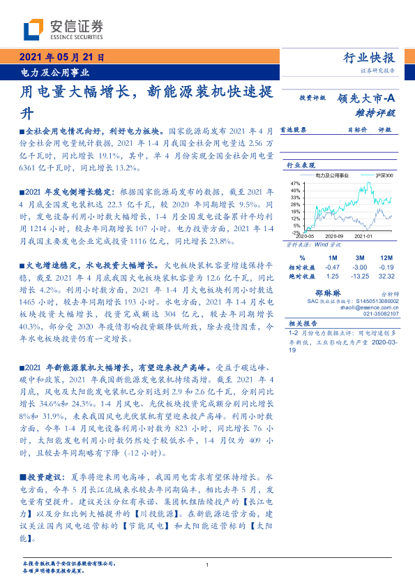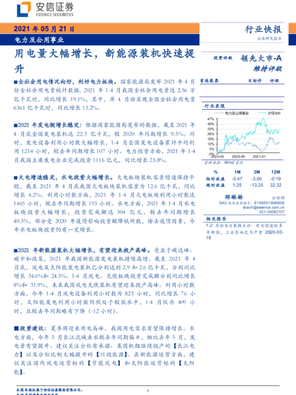 【安信证券】【20210521】电力及公用事业行业快报:用电量大幅增长,新能源装机快速提升-9页