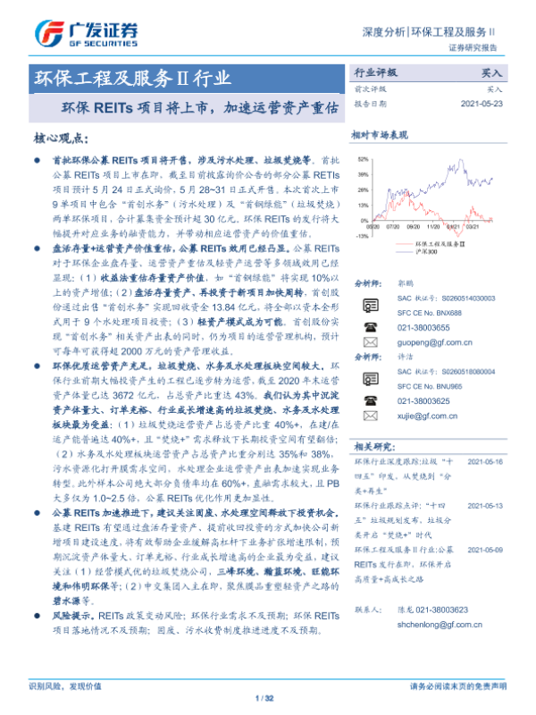【广发证券】【20210523】环保工程及服务Ⅱ行业:环保REITs项目将上市,加速运营资产重估-32页