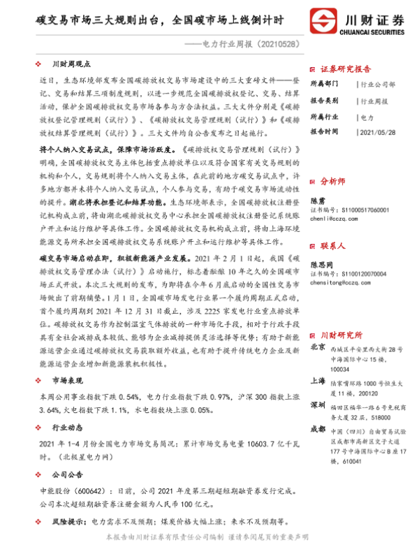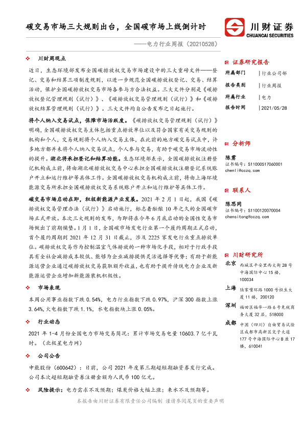 【川财证券】【20210528】电力行业周报:碳交易市场三大规则出台,全国碳市场上线倒计时-10页