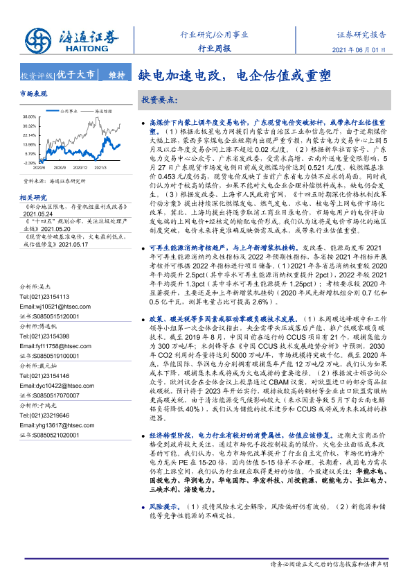 【海通证券】【20210601】公用事业行业周报:缺电加速电改,电企估值或重塑-4页