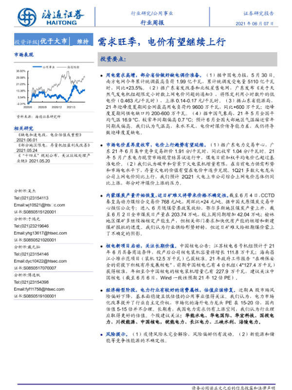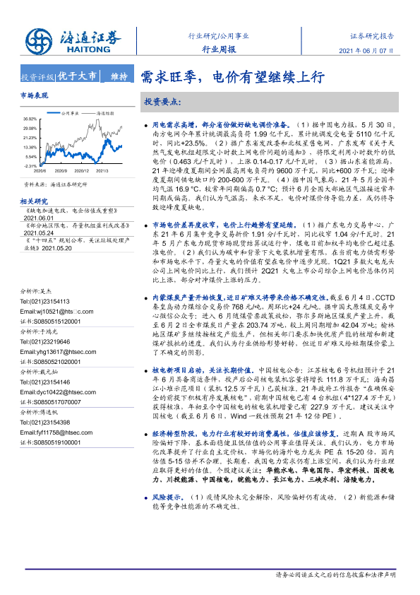 【海通证券】【20210607】公用事业行业周报:需求旺季,电价有望继续上行-2页