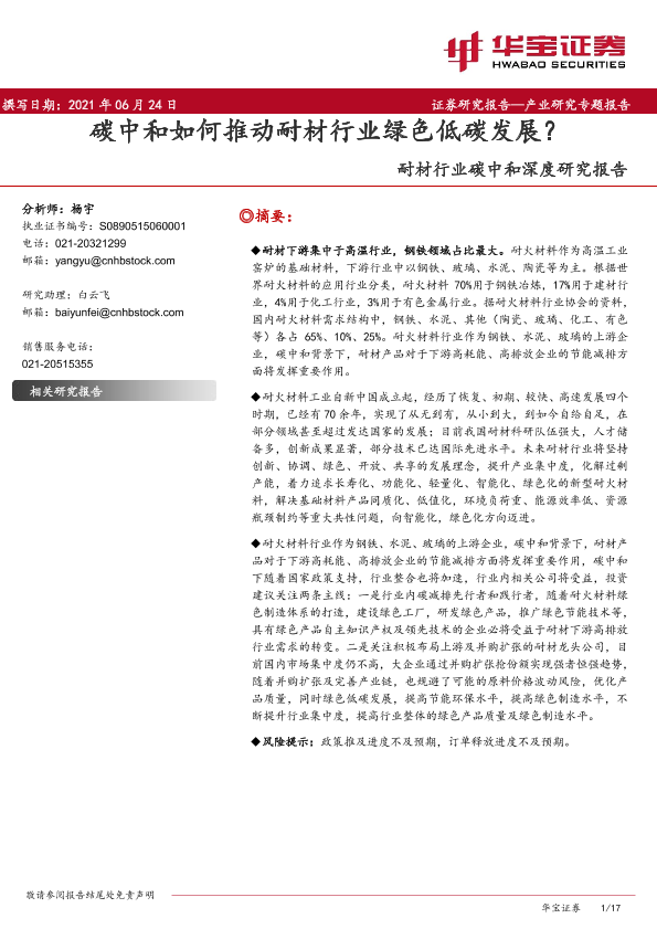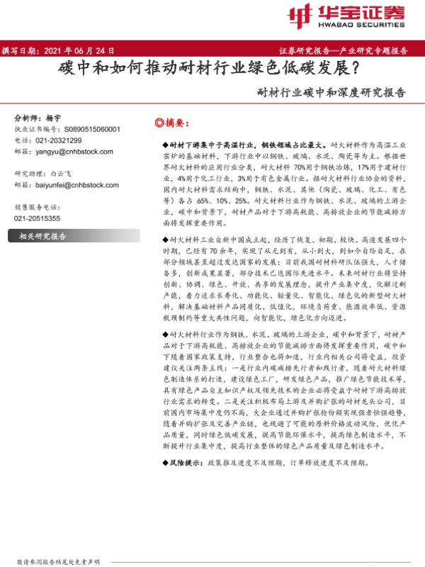 【华宝证券】【20210624】耐材行业碳中和深度研究报告:碳中和如何推动耐材行业绿色低碳发展?-17页
