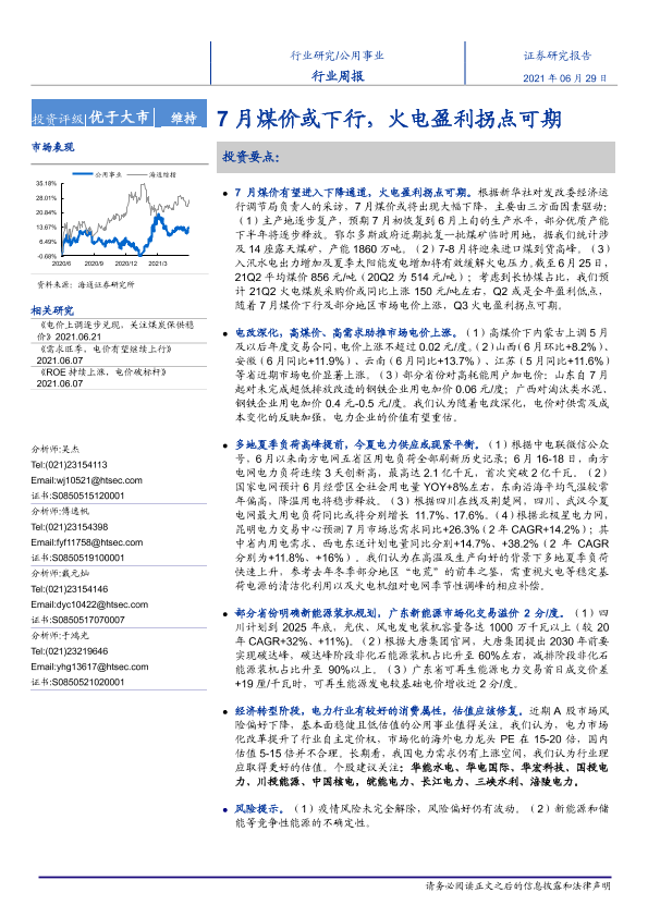 【海通证券】【20210629】公用事业行业周报:7月煤价或下行,火电盈利拐点可期-2页