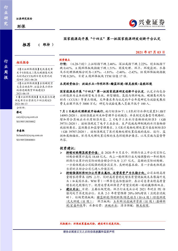 国家能源局 水处理新政 环保行业 研发创新平台 碳排放