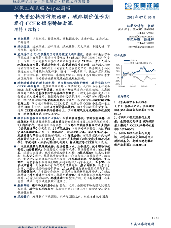 【东吴证券】【20210705】环保工程及服务行业周报:中央资金扶持污染治理,碳配额价值长期提升CCER短期稀缺看涨-31页