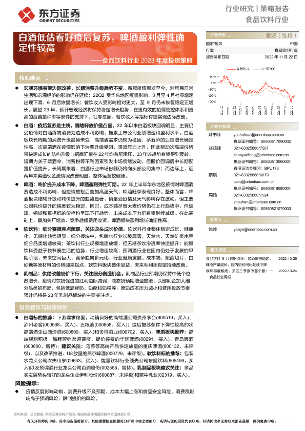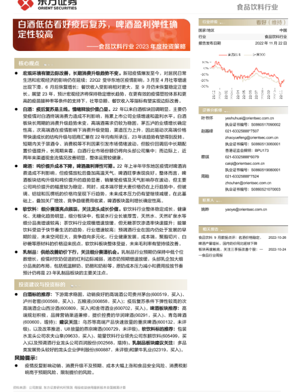 【东方证券】【20221122】食品饮料行业2023年度投资策略:白酒低估看好疫后复苏,啤酒盈利弹性确定性较高-51页