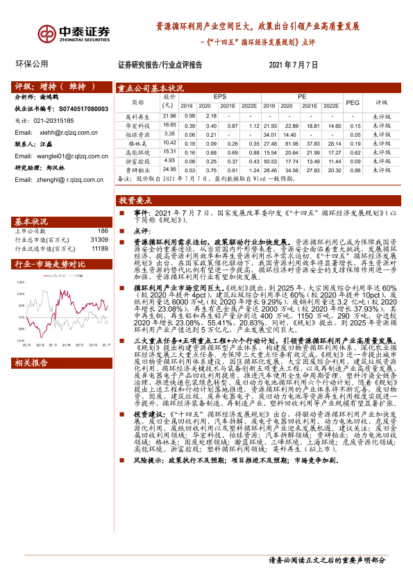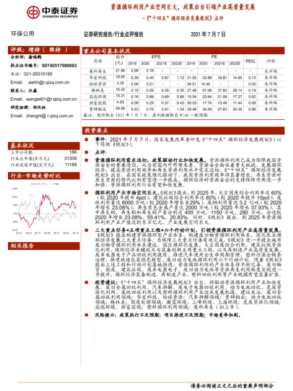 【中泰证券】【20210707】《“十四五”循环经济发展规划》点评:资源循环利用产业空间巨大,政策出台引领产业高质量发展-7页