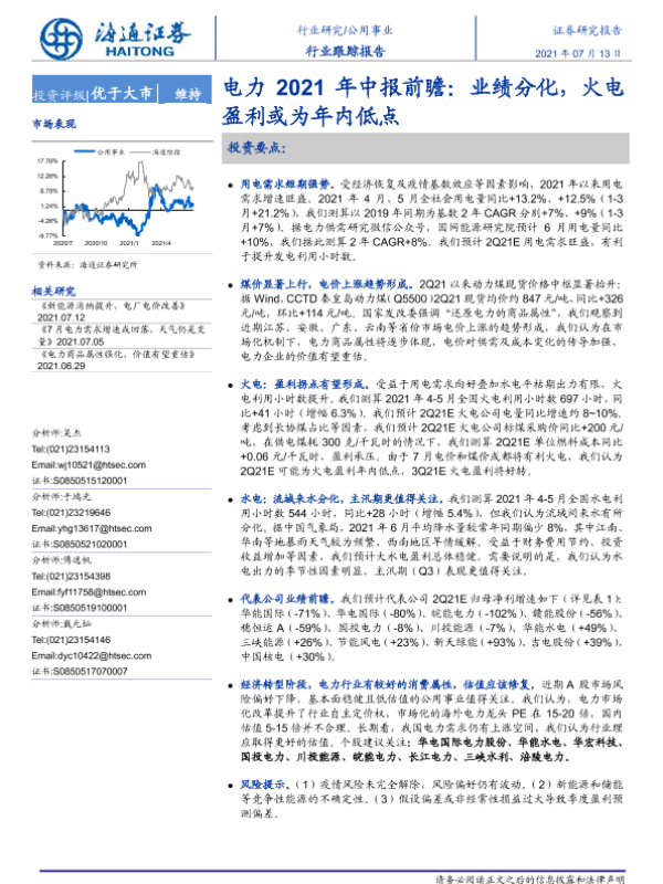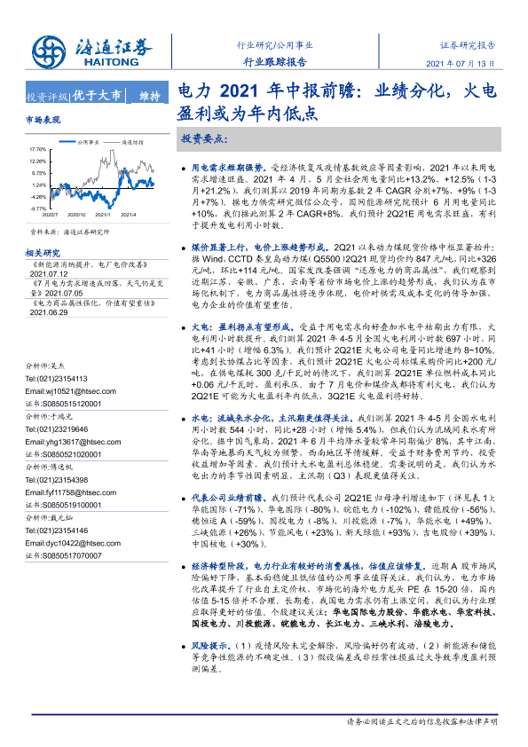 【海通证券】【20210713】电力2021年中报前瞻:业绩分化,火电盈利或为年内低点-3页