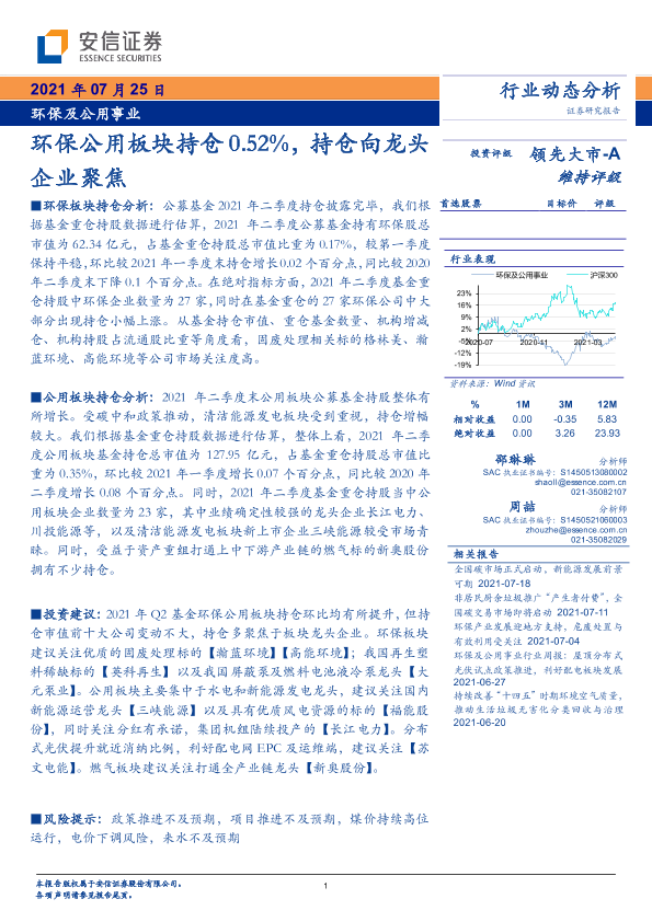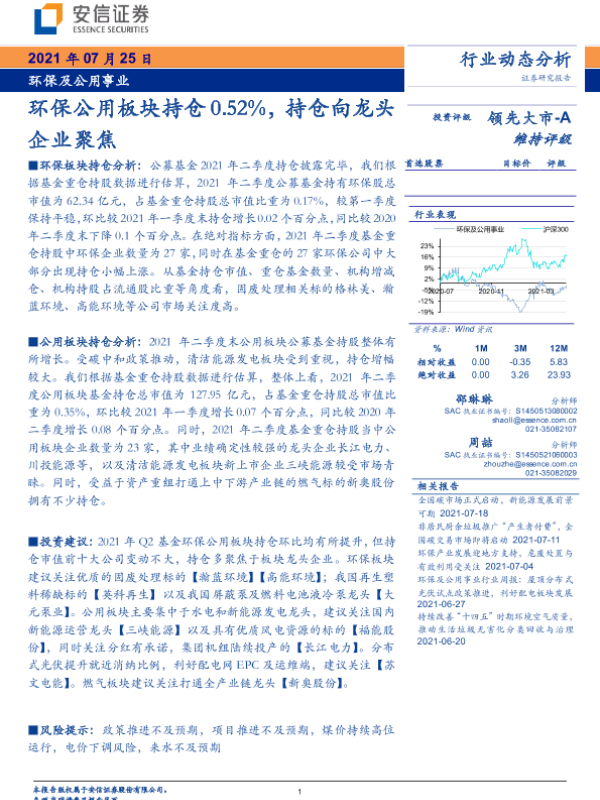 【安信证券】【20210725】环保及公用事业行业:环保公用板块持仓0.52%,持仓向龙头企业聚焦-9页