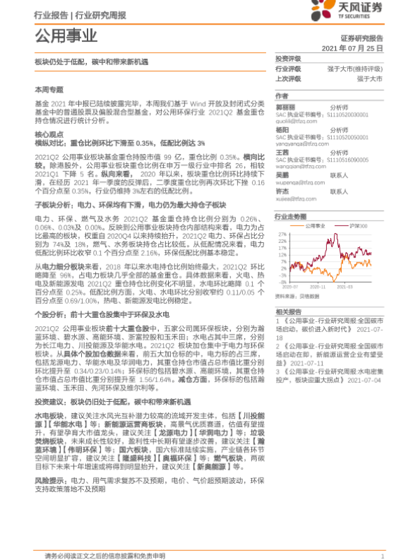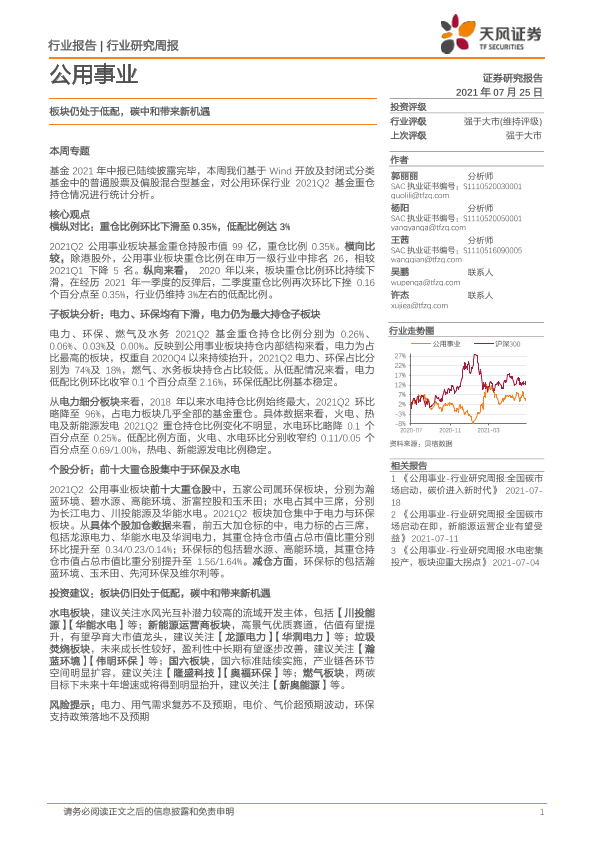 【天风证券】【20210725】公用事业行业研究周报:板块仍处于低配,碳中和带来新机遇-14页