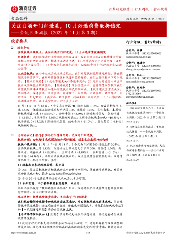 【浙商证券】【20221120】食饮行业周报(2022年11月第3期):关注白酒开门红进度,10月必选消费数据稳定-18页