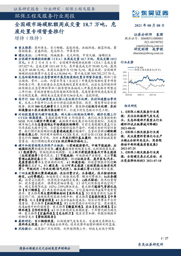 【东吴证券】【20210808】环保工程及服务行业周报:全国碳市场碳配额周成交量18.7万吨,危废处置专项督查推行-27页