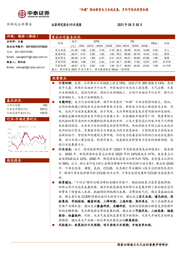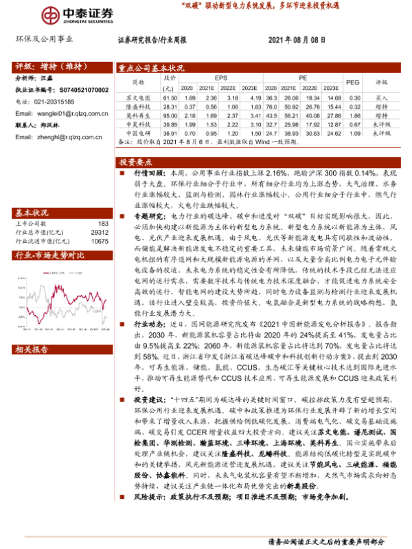 【中泰证券】【20210808】环保及公用事业行业周报:“双碳”驱动新型电力系统发展,多环节迎来投资机遇-21页