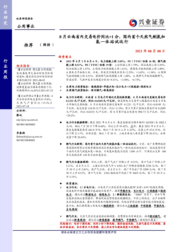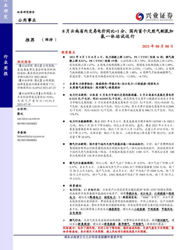 【兴业证券】【20210808】8月云南省内交易电价同比+1分,国内首个天然气制氢加氢一体站试运行-17页