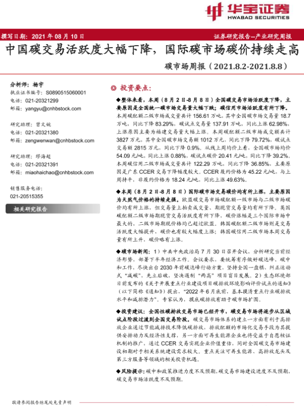 【华宝证券】【20210810】中国碳交易活跃度大幅下降,国际碳市场碳价持续走高-15页