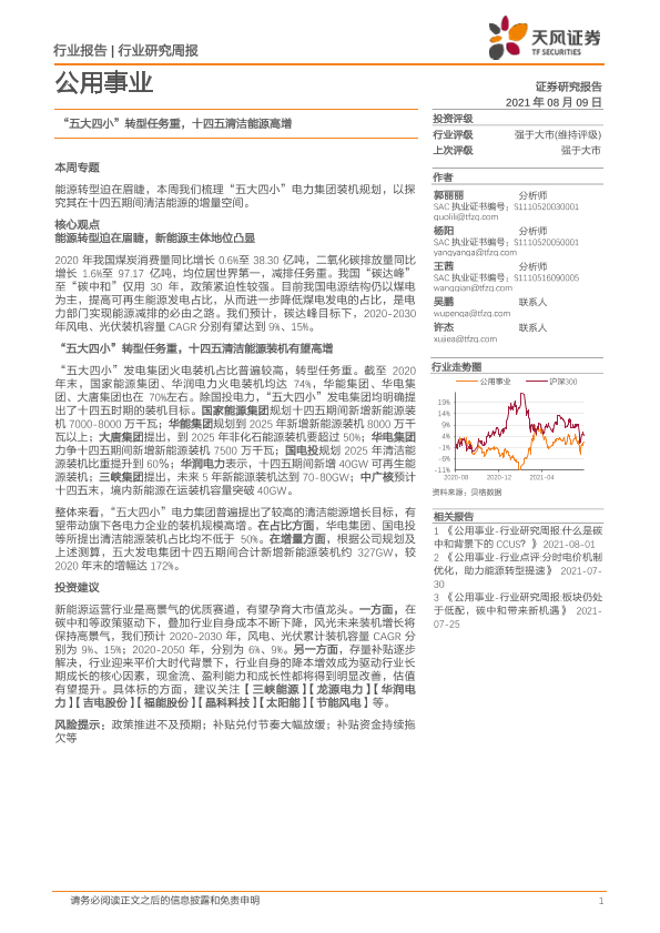 【天风证券】【20210809】公用事业行业研究周报:“五大四小”转型任务重,十四五清洁能源高增-17页