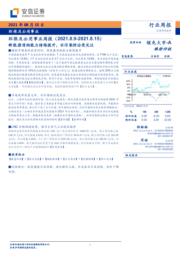 【安信证券】【20210815】环保及公用事业周报:新能源消纳能力持续提升,水污染防治受关注-16页