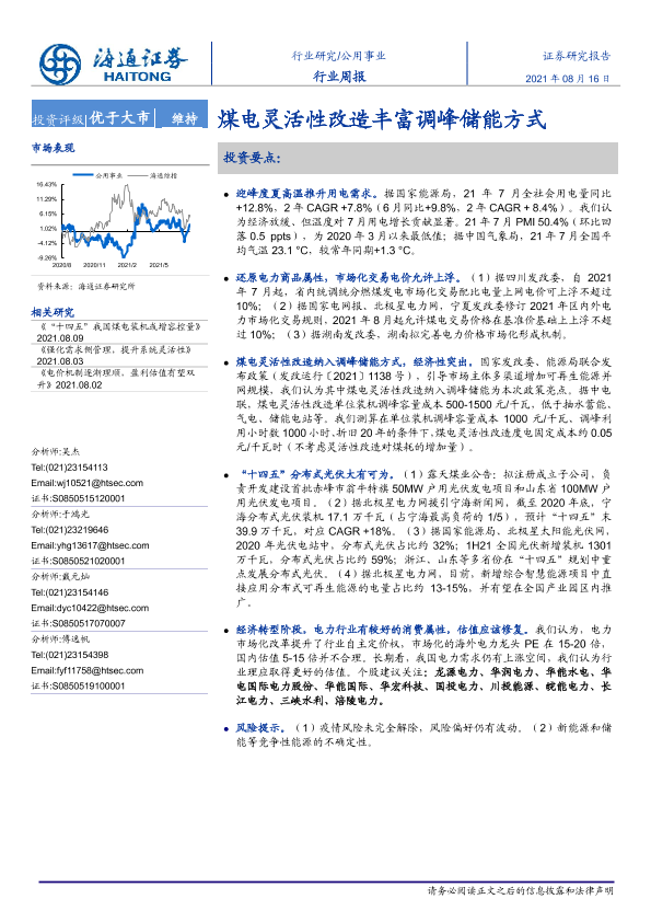 【海通证券】【20210816】公用事业行业周报:煤电灵活性改造丰富调峰储能方式-2页