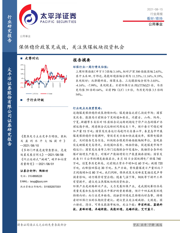 【太平洋证券】【20210815】公用事业行业周报:保供稳价政策见成效,关注焦煤板块投资机会-12页