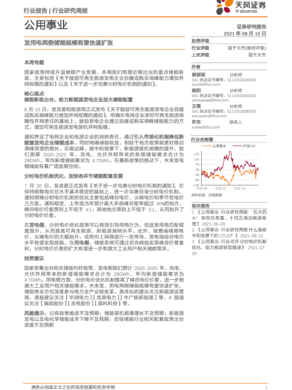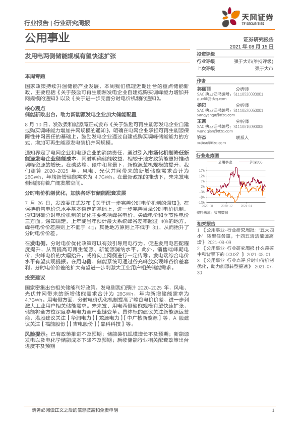 【天风证券】【20210815】公用事业行业研究周报:发用电两侧储能规模有望快速扩张-14页