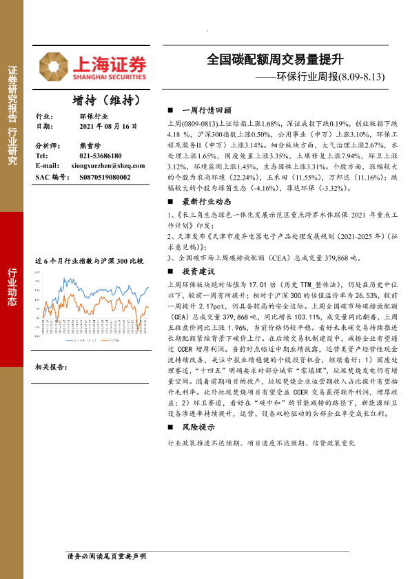 【上海证券】【20210816】环保行业周报:全国碳配额周交易量提升-8页
