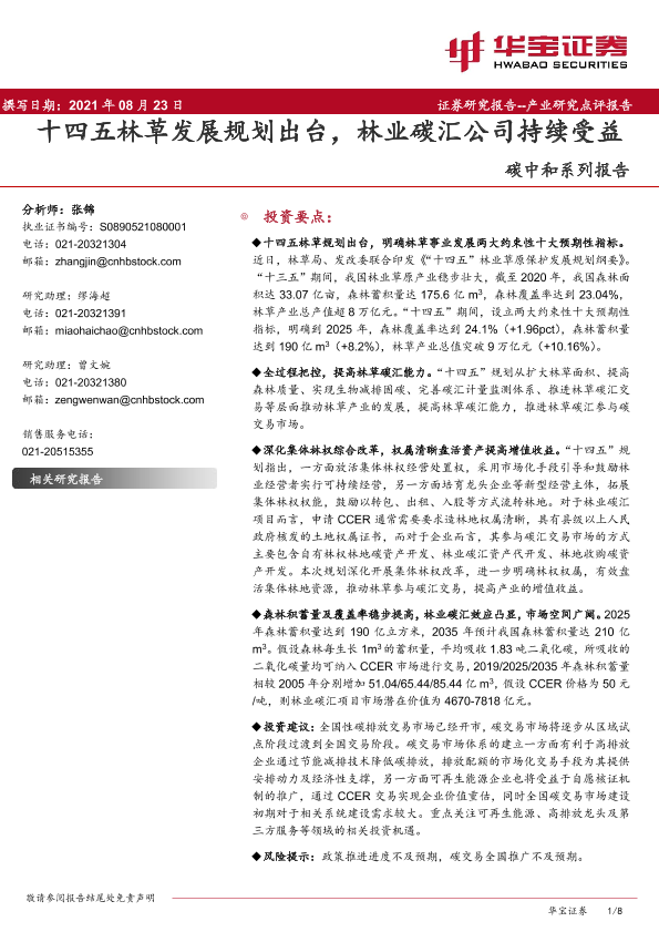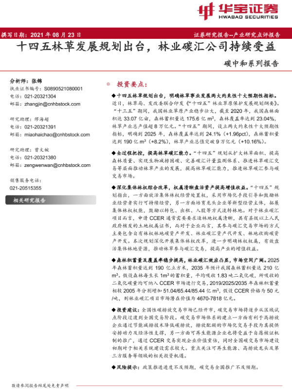 【华宝证券】【20210823】十四五林草发展规划出台,林业碳汇公司持续受益-8页