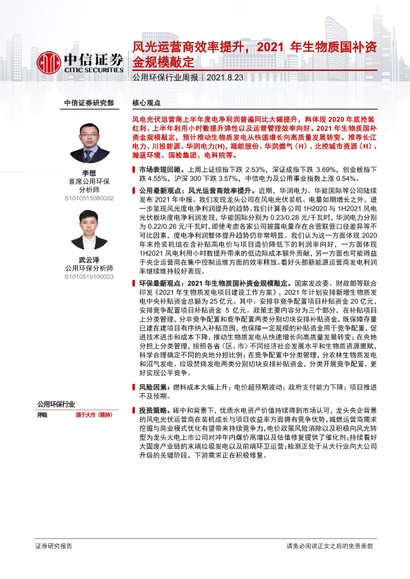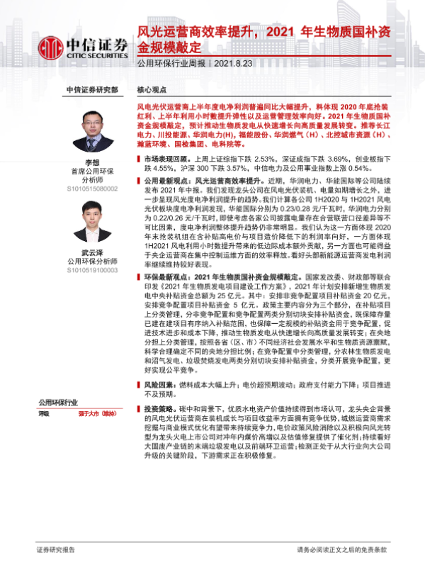 【中信证券】【20210823】公用环保行业周报:风光运营商效率提升,2021年生物质国补资金规模敲定-9页